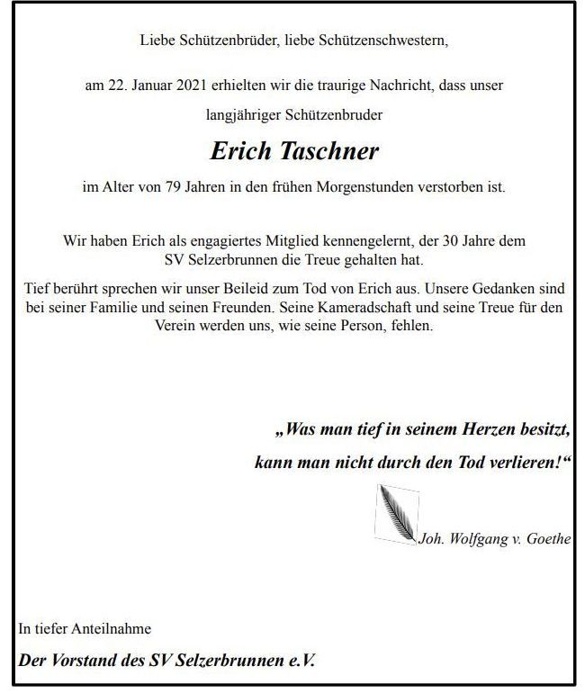Tief berührt sprechen wir unser Beileid zum Tod von Erich aus. Unsere Gedanken sind bei seiner Familie und seinen Freunden. Seine Kameradschaft und seine Treue für den Verein werden uns, wie seine Person, fehlen.